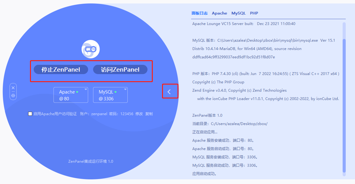 点击右侧的展开按钮,可以查看运行控制面板的日志信息,以及Apache、MySQL、PHP的版本和运行信息。